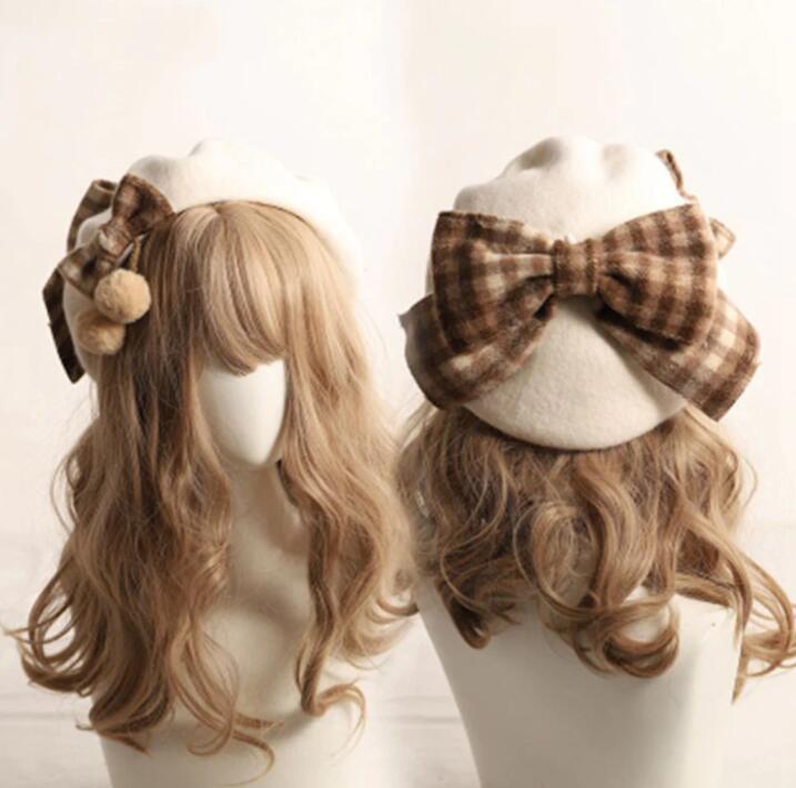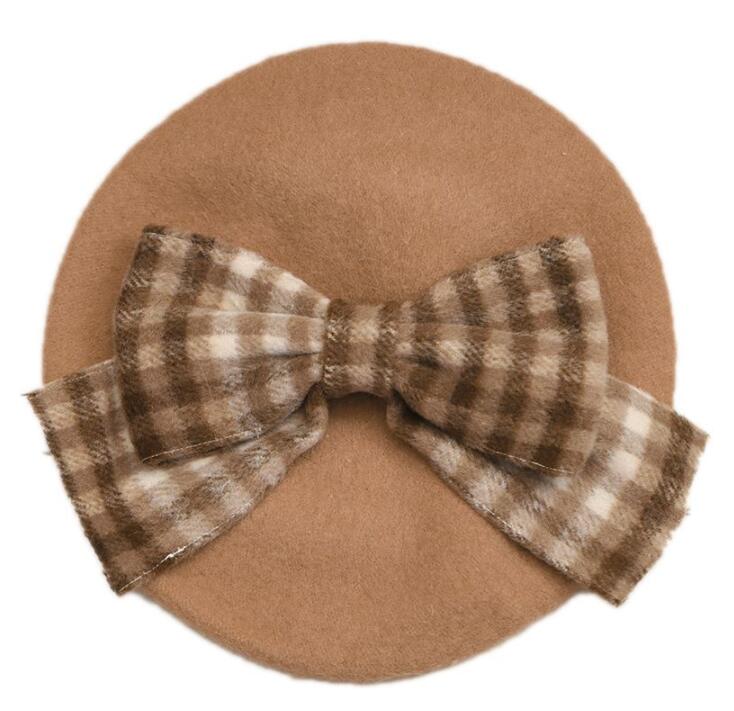 Plaid Bowknot Woolen Beret Hat
