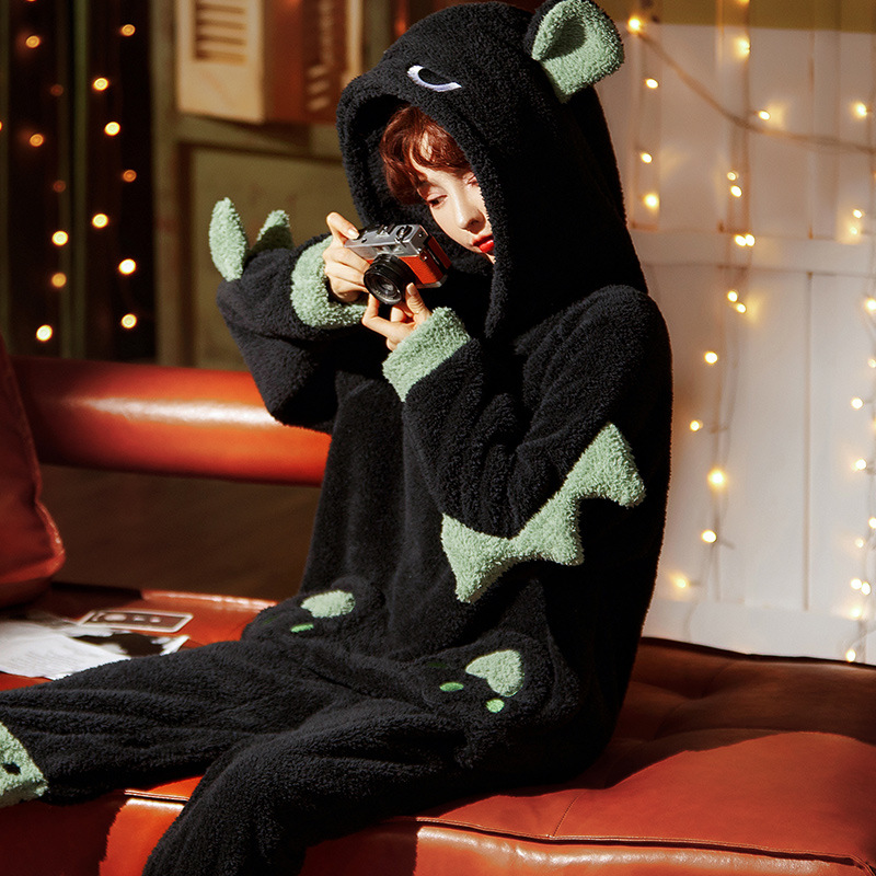 Black Dinosaur Cartoon Hooded Fluffy Warm Pajama Nightgown
