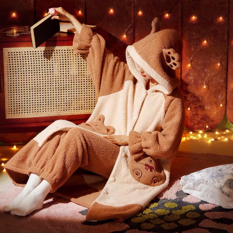 Kawaii Cartoon Ears Hooded Fluffy Warm Pajama Set Nightgown