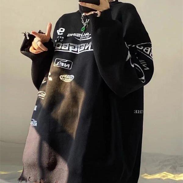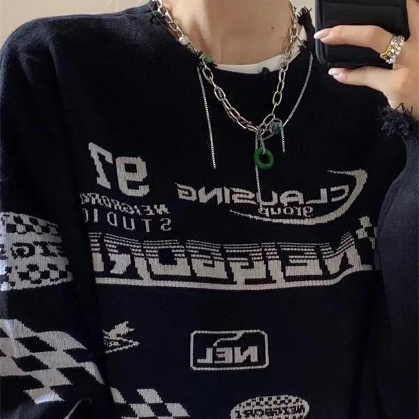 Retro Frayed Racing Suit Letter Jacquard Black Sweater