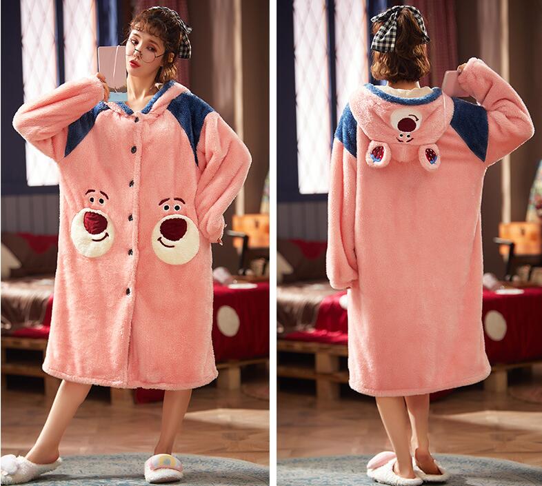 Cute Pink Cartton Hooded Fluffy Warm Pajama Nightgown