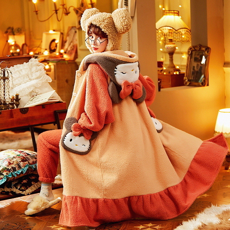 Kawaii Kitty Cartoon Hooded Fluffy Warm Pajama Set Nightgown