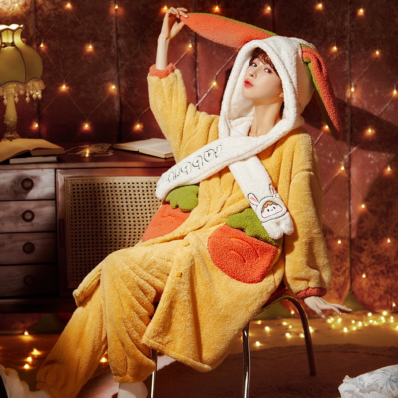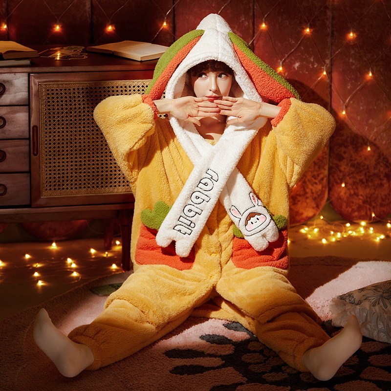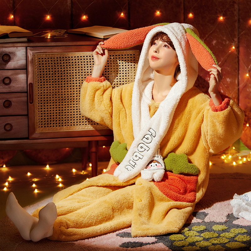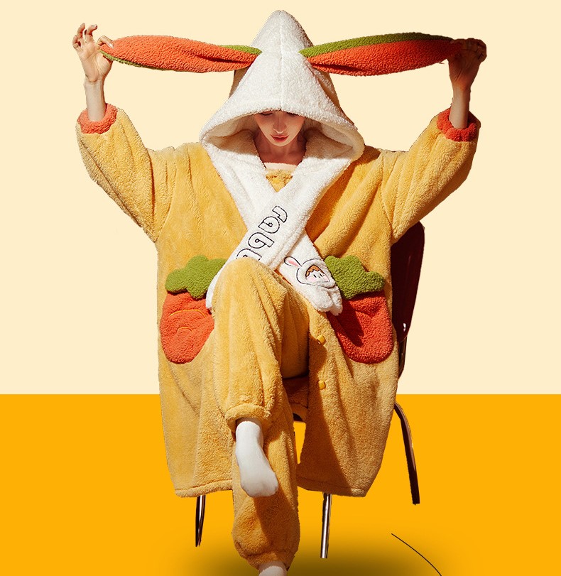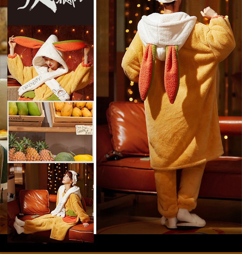 Cute Carrot Bunny Ears Hooded Fluffy Warm Pajama Set Nightgown